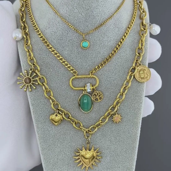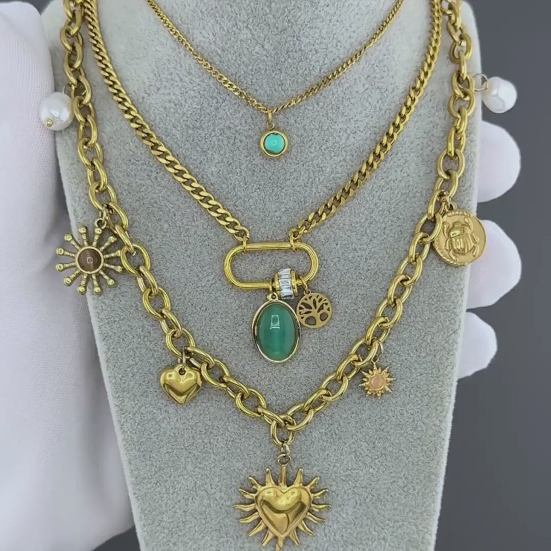 Elevate your look with The Amara Turquoise Harmony Necklace, a layered statement piece that blends elegance and meaning. Crafted with radiant 18K gold plating, this necklace features two layers — a delicate chain with a turquoise pendant and a bold link chain adorned with a natural turquoise stone, crystal accent, and a symbolic Tree of Life charm. Designed for balance, growth, and inner peace, Amara embodies timeless sophistication and mindful beauty. Perfect for everyday wear or layered luxury looks, this hypoallergenic, waterproof, and tarnish-resistant piece adds a touch of golden serenity to any outfit.