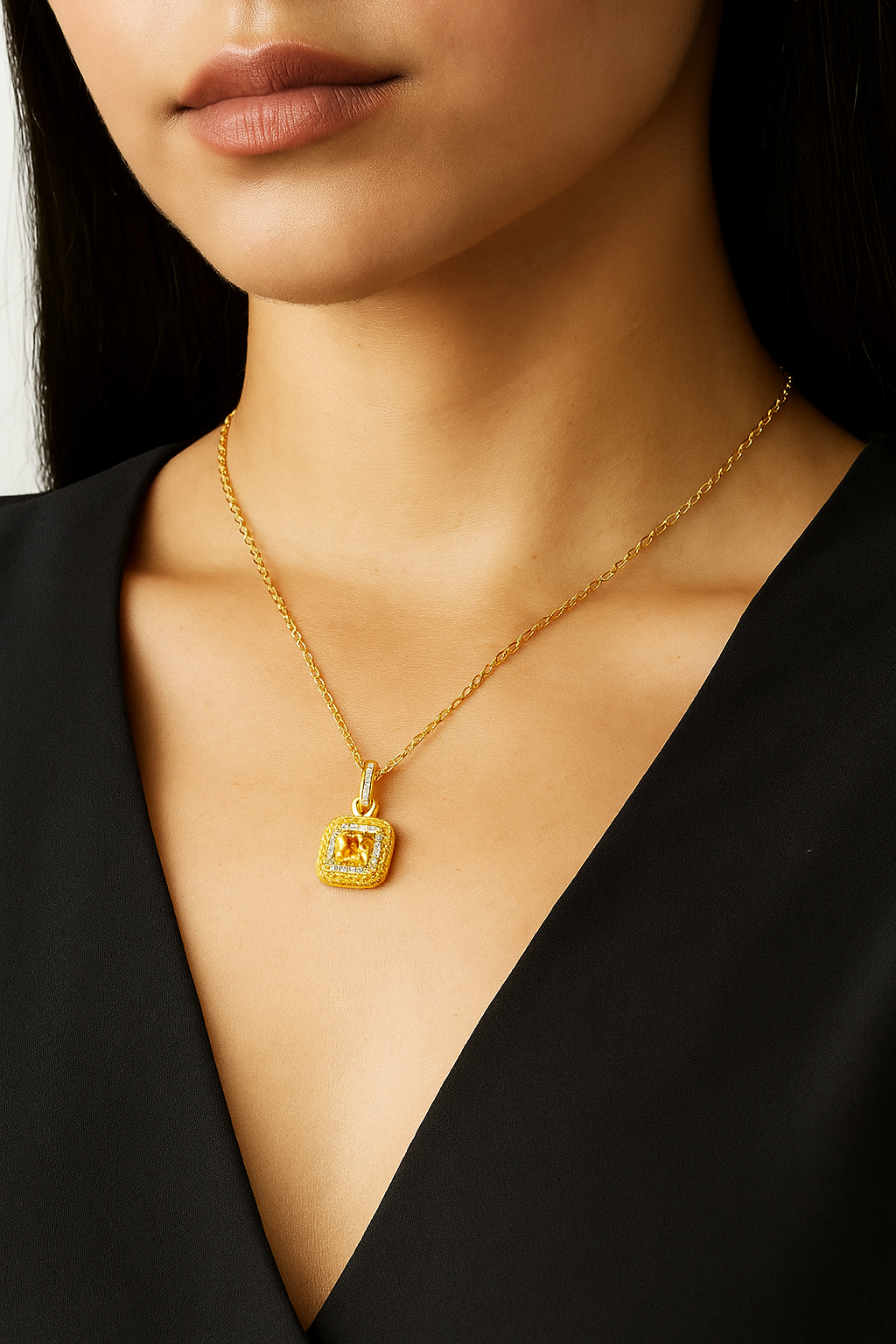 Elena Radiance Necklace — 18K gold-plated pendant with yellow princess-cut crystal and cubic zirconia halo on a dainty link chain, mass: 39.