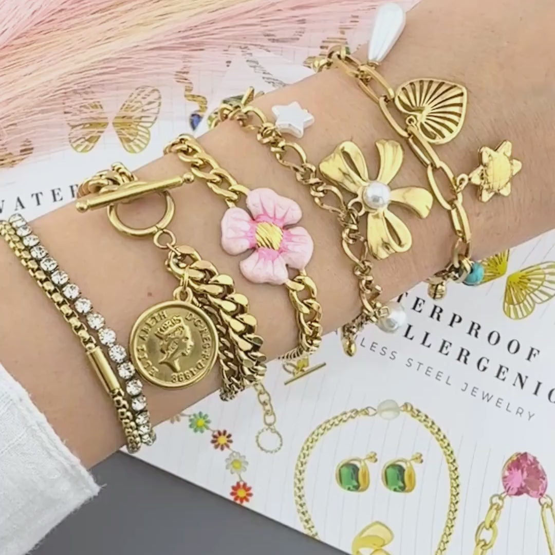 Meet The Camila Charm Bracelet, a playful yet elegant piece designed to capture your radiant personality. This waterproof and hypoallergenic bracelet features a mix of gold-plated charms — a dainty flower, heart, pearl drop, and gemstone accents — symbolizing joy, love, and individuality. Perfect for stacking or wearing solo, Camila adds a touch of modern luxury to any look.